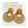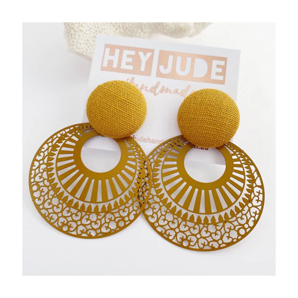 A large fabric covered button stud top is adorned with a round filigree enamel painted embellishment. A luscious combo in 3 striking colours = super eye catching earrings!
