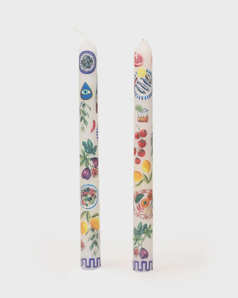 Beautifully Illustrated Dinner Candles are made from paraffin wax and feature a braided cotton wick. Unscented and lead-free, each candle stands 25cm tall and 2 cm wide, providing up to 6 hours of warm ambience.
