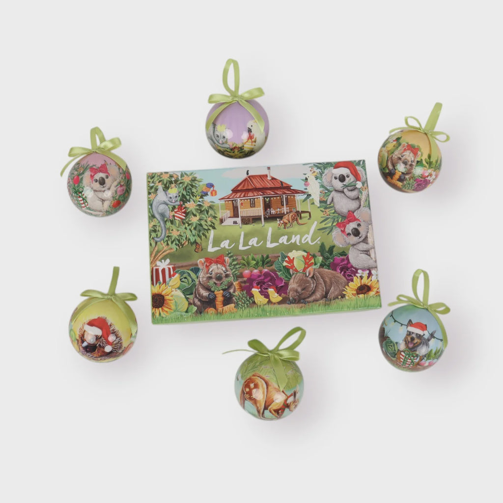 Introducing our Garden Giggles Bauble Set by La La Land artist, Laura Ramos. Elevate your holiday decor with our Bauble Set, featuring 6 unique illustrated baubles, each a masterpiece showcasing the whimsical illustrations from our Garden Giggles collection. Lightweight and captivating, these baubles come in a charming gift box for easy storage. Embrace the spirit of Australian rural living and make your holidays truly meaningful with the Garden Giggles bauble set!